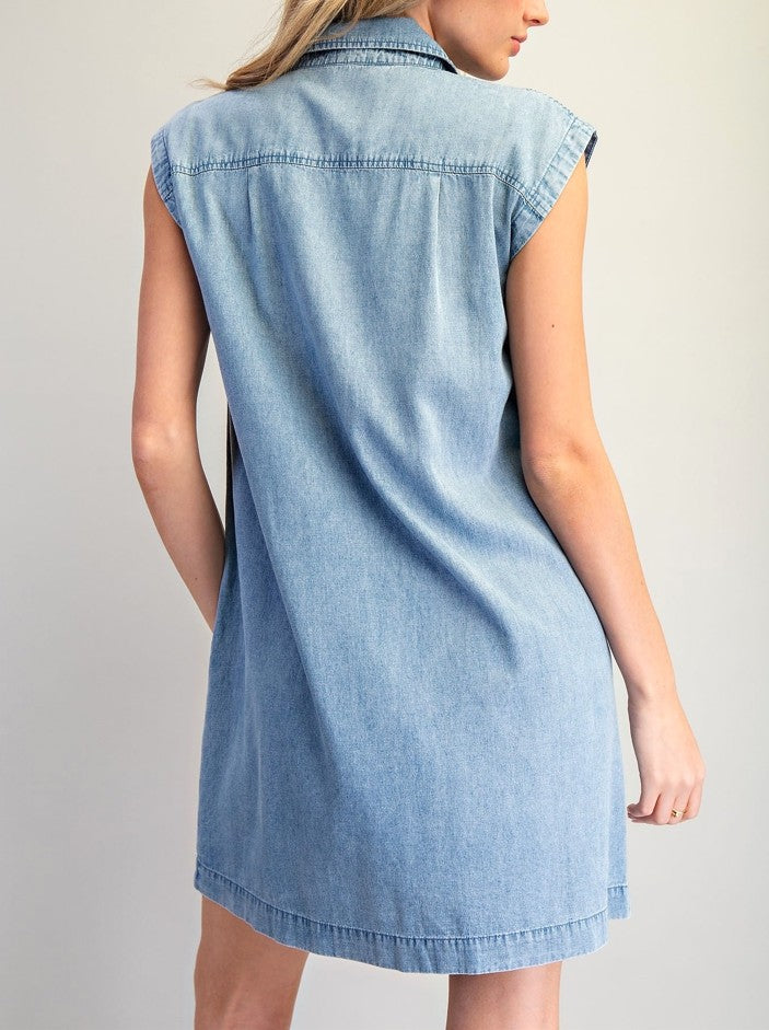 This sleeveless denim dress features a pointed collar with a partial button front placket, curved front patch pockets, and subtle seaming throughout for a clean, relaxed silhouette.