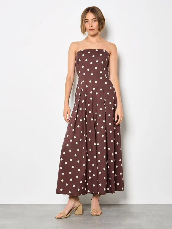 Embrace warm-weather style with this timeless polka dot jumpsuit. Lightweight and woven, it boasts a wide-leg silhouette, pleating, and a cut-out back with bow detailing. Style this polka dot jumpsuit with heeled sandals and a clutch for your next event.