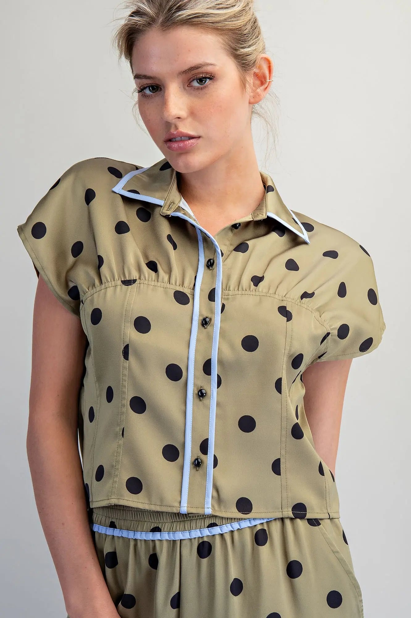 This cap sleeved, button down top features a classic polka dot pattern and a sophisticated collar, detailed with contrasting piping along the edges and a gathered seam at the bust for a flattering, structured silhouette.